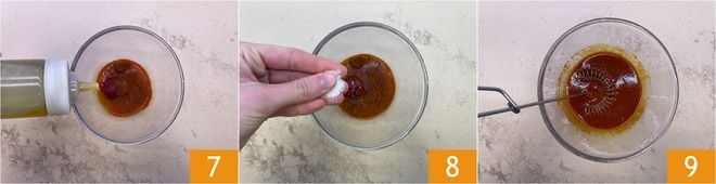 Completad con aceite de oliva 7 y una pizca de sal 8. Mezclad bien para emulsionar la marinada 9.