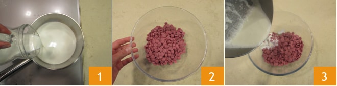 Para preparar la ganache de chocolate ruby, comenzad calentando la nata, dejándola que casi hierva 1. Mientras tanto, verted el chocolate ruby en perlas, o picado con cuchillo, en un bol grande 2. En cuanto la nata esté caliente, vertedla sobre el chocolate 3.