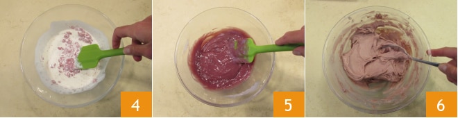 Mezclad inmediatamente para derretir el chocolate ruby 4 y cuando los ingredientes estén completamente integrados, podréis usar vuestra ganache de chocolate ruby 5. Si preferís el efecto montado, bastará con cubrir la ganache con film en contacto y después de al menos 2 horas, trabajad enérgicamente con una cuchara antes de usarla 6.