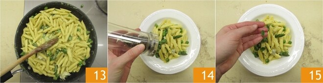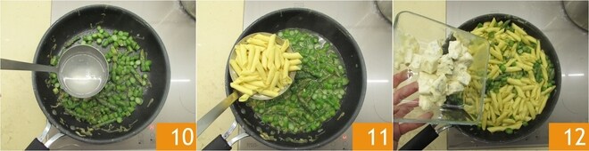 Vierte un cucharón de agua de la pasta sobre los espárragos 10, escurre los garganelli en la sartén 11 y termina la cocción. Apaga el fuego y añade el gorgonzola 12.