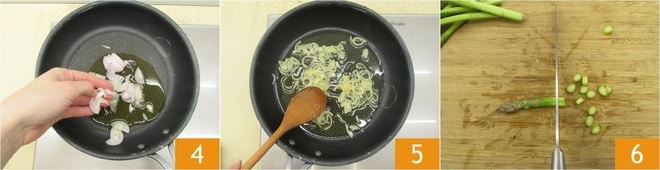 Echa la chalota 4 y deja que se ablande 5. Corta en rodajas los espárragos 6.