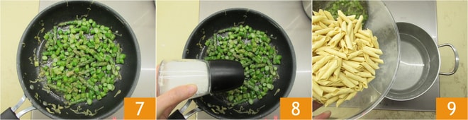 Vierte los espárragos en la sartén 7 y déjalos cocinar a fuego medio durante unos 10 minutos, o el tiempo necesario para que se ablanden, añadiendo sal a mitad de cocción 8. Cocina los garganelli en agua hirviendo con sal 9 dejando la cocción un par de minutos menos.