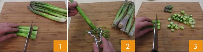 Para preparar los garganelli al ragú de espárragos y calabacines, empieza haciendo el caldo de verduras. Continúa limpiando los espárragos con el pelador de patatas - elimina la parte blanca con un cuchillo hasta igualarlos 1 y luego con el pelador de verduras quita la parte exterior del tallo, la más fibrosa 2, y finalmente córtalos en rodajas y deja enteras las puntas 3.