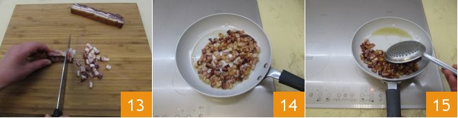 Mientras tanto, corta el bacon en daditos 13 y viértelo en una sartén para saltearlo a fuego medio: remueve de vez en cuando para que se dore y esté crujiente 14. Luego apaga el fuego y escurre el bacon del exceso de grasa. 15