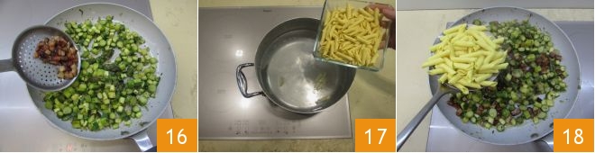 Vierte el bacon crujiente sin el exceso de grasa en la sartén con los espárragos y calabacines ya cocidos 16. Ahora cocina los garganelli en abundante agua con sal a tu gusto 17, escúrrelos al dente (asegúrate de conservar 100 g de agua de cocción) y agrégalos al ragú de verduras 18.