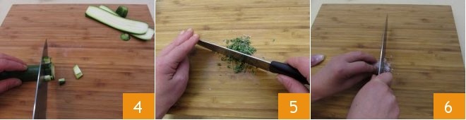 Continúa lavando también el calabacín, quítale los extremos y córtalo en daditos 4. Luego pica el tomillo 5. Por último, pica finamente la chalota, después ve a cocinar el ragú de verduras 6.