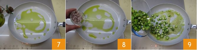 En una sartén grande, vierte el aceite 7 y sofríe la chalota a fuego lento 8, luego vierte los calabacines y deja cocinar durante unos 5 minutos 9.