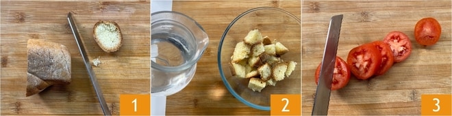 Para preparar el gazpacho andaluz, lo primero que hay que hacer es cortar el pan duro en trozos 1, colocarlo en un bol y cubrirlo con 150 g de agua 2. Déjalo en remojo unos minutos mientras preparas el resto de los ingredientes: lava y corta los tomates en rodajas 3.