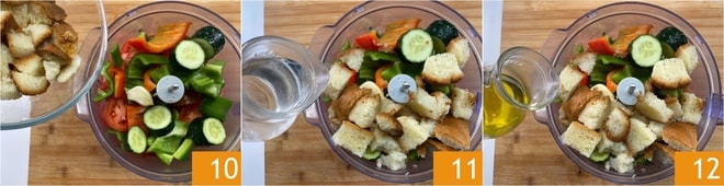 Añade también el pan remojado y escurrido 10, luego vierte los restantes 250 g de agua fría 11 y el aceite 12.