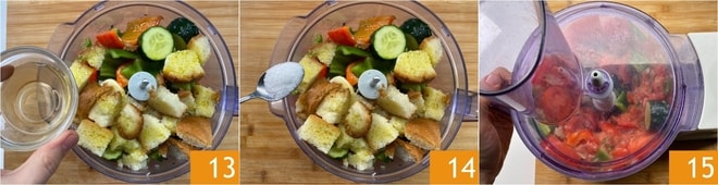 Por último, añade el vinagre 13, la sal 14 y la pimienta. Cierra y mezcla durante unos 30 segundos 15.
