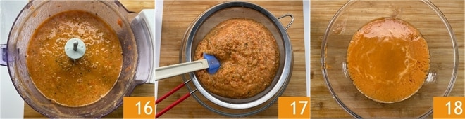 Cuando hayas obtenido una mezcla homogénea 16, pásala por un colador de malla fina colocado sobre un bol y presiona con la espátula para colar 17. De este modo eliminarás los restos de pieles y obtendrás una consistencia suave y fluida 18. Deja reposar en el frigorífico durante al menos 2 horas, cubierto con film.