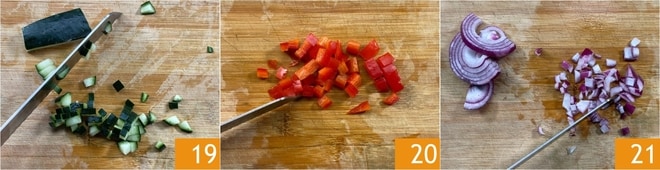 Pasado el tiempo de reposo, prepara los ingredientes para la decoración: corta en dados el pepino 19, el tomate 20 y la cebolla roja 21.