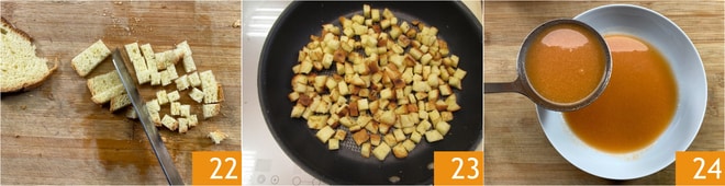 Reduce a cubos también el pan 22 y tuéstalo en la sartén 23. Ahora saca el gazpacho del frigorífico y viértelo en los platos 24.
