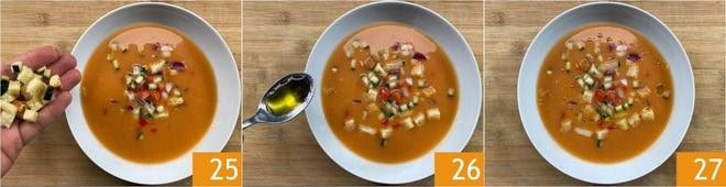 Decora con las verduras y los cubitos de pan tostado 25, luego adereza con un chorrito de aceite 26 y una pizca de pimienta. ¡Tu gazpacho andaluz está listo para ser disfrutado 27!