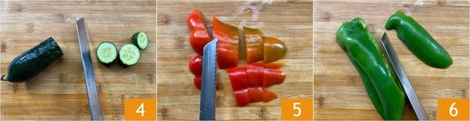 Haz lo mismo con los pepinos sin pelarlos 4. Finalmente, limpia los pimientos y córtalos en trozos, tanto los rojos 5 como los verdes 6.