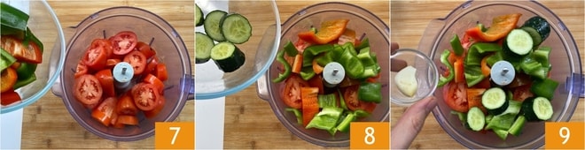 Pon los tomates en un mezclador, luego añade los pimientos 7, los pepinos 8 y el diente de ajo 9.