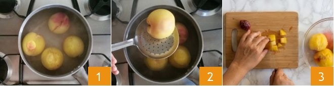 Para realizar las gelatinas de melocotón y yogur, primero escaldad en agua hirviendo 800 g de melocotones durante 3 minutos 1 (el otro melocotón lo necesitaréis para decorar). Luego escurridlos 2, dejadlos templar, peladlos y cortadlos en trozos 3.