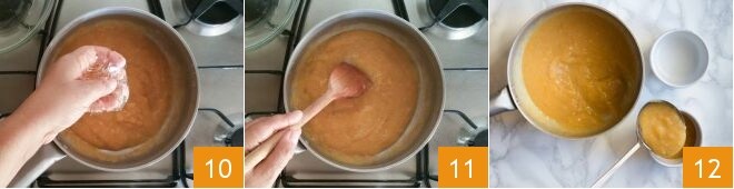 Una vez que las hojas de gelatina estén blandas, escurridlas y añadidlas al puré caliente 10. Mezclad para que se disuelva bien la gelatina 11. Verted la mezcla en 4 moldes de 7 cm de diámetro 12 y dejad que se endurezcan en la nevera durante al menos 4 horas.