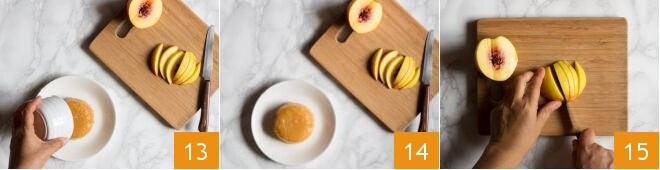 Pasado este tiempo, desmoldad las gelatinas dándoles la vuelta sobre un platillo (13-14). Cortad en rodajas regulares los melocotones restantes 15 y reservad.