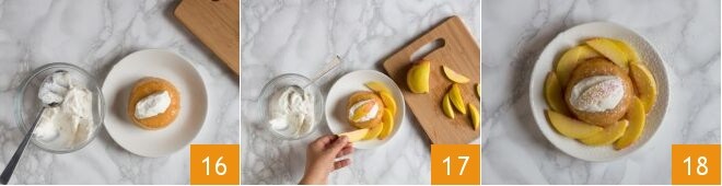 Ahora decorad las gelatinas con una cucharada de yogur 16, distribuid alrededor las rodajas de melocotón 17 y para terminar espolvoread la superficie con azúcar glas. Vuestras gelatinas de melocotón y yogur están listas para ser disfrutadas 18.