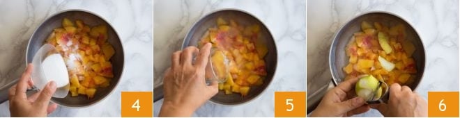 Verted los melocotones en una cacerola y añadid el azúcar 4, el agua 5 y la cáscara de limón 6. Poned al fuego y coced durante unos 20 minutos.