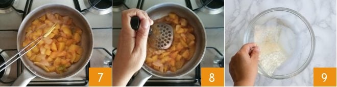 Pasado este tiempo, eliminad la cáscara de limón con unas pinzas de cocina 7 y triturad los melocotones hasta formar un puré 8. Mientras tanto, ablandad durante 10 minutos las hojas de gelatina en agua fría 9.