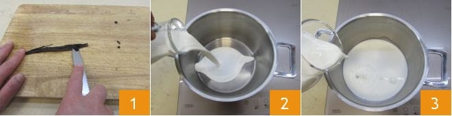Para preparar el helado de nata, toma la vaina de vainilla, ábrela y raspa la pulpa interna con la hoja de un cuchillo pequeño 1. Reserva. Luego toma un cazo con bordes altos y vierte la leche 2 y la nata 3.