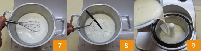 Calienta a fuego lento para derretir el azúcar mientras mezclas con un batidor de mano 7: tardará unos 2-3 minutos. La mezcla debe acercarse al punto de ebullición. Una vez alcanzada la temperatura, apaga el fuego y elimina la vaina de vainilla 8. Deja enfriar la mezcla hasta alcanzar la temperatura ambiente. En este punto, vierte la mezcla en la heladera 9. Para esta heladera no es necesario enfriar el recipiente en el frigorífico.