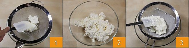 Para preparar el helado de ricotta, empieza justo por esta última. Pon la ricotta en el frigorífico a escurrir en un colador de malla fina con un cuenco debajo y cubre con film transparente. Puedes hacerlo la noche anterior o unas horas antes de la preparación para que la ricotta pierda el suero en exceso. Luego, tamiza la ricotta con un colador y la ayuda de una espátula 1 o con el dorso de una cuchara y recógela en un cuenco 2. Repite la operación al menos 3 veces tamizando la ricotta con la espátula y el colador para hacerla más cremosa 3. Una vez tamizada, resérvala.