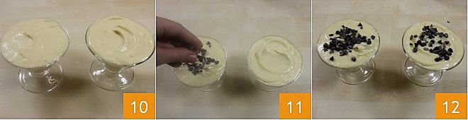 Pasado el tiempo necesario, saca el cuenco del frigorífico y vierte el helado en copas 10 con una cucharilla o con una manga pastelera equipada con una boquilla lisa. Puedes adornar tu helado de ricotta con gotas o virutas de chocolate (11-12), o puedes adornarlo según los gustos de tus invitados: con granillo de avellanas, galletas enteras o desmenuzadas, hojas de menta o acompañarlo con fruta fresca. Alternativamente, para una consistencia de "semifrío" puedes crear una mezcla más granulosa y cremosa como indicado en la segunda secuencia: reviste con papel de horno mojado unos moldes, llénalos con la crema obtenida y colócalos en el frigorífico cubiertos con film transparente para que se solidifiquen. Una vez pasado el tiempo necesario, desmóldalos dándoles la vuelta sobre platillos de postre!