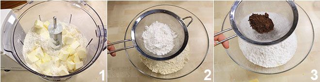 Para preparar el helado de galleta, comienza a preparar la masa para las galletas: desmenuza la mantequilla fría en trozos con la harina en un procesador de alimentos 1, mueve el polvo obtenido a un bol grande y tamiza dentro también el azúcar glas y el cacao (2-3). Mezcla bien las harinas entre sí.