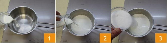 Para preparar el helado de menta y chocolate, primero vierte la leche en un cazo 1, caliéntala añadiendo la nata fresca 2 y añade el azúcar 3.