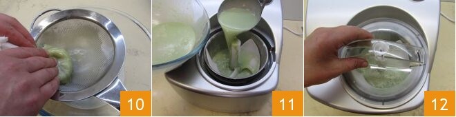 Exprime bien 10 para asegurarte de filtrar completamente el compuesto, viértelo todo en la heladera 11 y enciéndela durante 30 minutos 12.