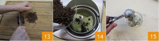 Una vez transcurridos los 30 minutos, toma el chocolate negro y córtalo groseramente con un cuchillo 13. Luego viértelo en la heladera 14, enciéndela durante unos minutos y tu helado de menta y chocolate estará listo. Si no tienes heladera, coloca el compuesto líquido y a temperatura ambiente en el congelador dentro de un bol, recordando removerlo cada media hora hasta obtener la consistencia perfecta. Una vez detenida la heladera, transfiérelo a un recipiente bajo y amplio, mejor si es de vidrio o acero y guárdalo en el congelador durante al menos 2-3 horas antes de servirlo 15.