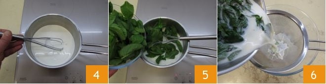 Derrite el azúcar ayudándote con una varilla 4 y, una vez derretido completamente, lava las hojas de menta, sécalas con un paño de cocina, luego viértelas en el cazo 5. Remueve y deja calentar durante unos 3-4 minutos, hasta que se haya derretido el azúcar, luego apaga el fuego y deja en infusión durante al menos una hora. Transcurrido el tiempo de infusión, cuela la nata y la leche ayudándote con un colador 6.