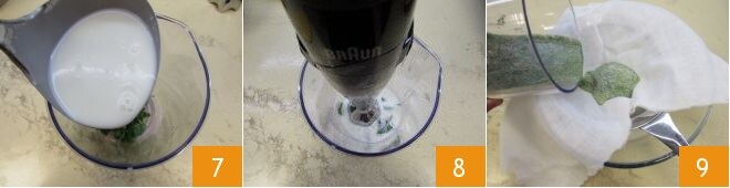 Toma aproximadamente la mitad de las hojas de menta, luego transfiérelas a la licuadora, junto con la leche y la nata 7 (si deseas un sabor más intenso de menta puedes licuarlas todas), licua todo 8. Después, filtra con una gasa de cocina el compuesto en un bol con la ayuda de un colador 9.