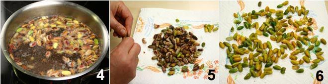 Luego ocúpate de los pistachos: para pelarlos bastará con escaldarlos durante unos minutos en un cazo 4, luego escúrrelos y colócalos sobre un trozo de papel absorbente para secar el exceso de agua. La piel se desprenderá fácilmente aplicando una ligera presión con los dedos (5-6).