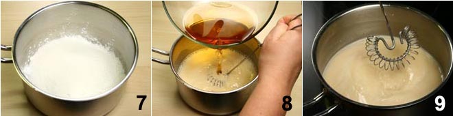 En un cazo, combina el almidón y el azúcar 7, luego añade el agua filtrada 8. Coloca el cazo en el fuego y remueve hasta que espese 9.