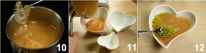 Una vez que haya alcanzado una consistencia viscosa 10, apaga el fuego y vierte la gelatina de canela en los cuencos 11 y deja enfriar. Sirve la gelatina de canela espolvoreando la superficie con un picadillo de pistachos 12.