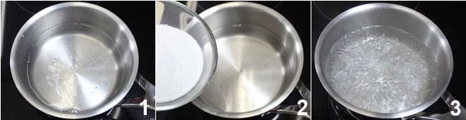 Para preparar los polos de fresa, empieza preparando un jarabe: pon a calentar el agua en un cazo 1 y añade el azúcar 2, deja que se disuelva completamente el azúcar, apaga el fuego y deja enfriar 3.