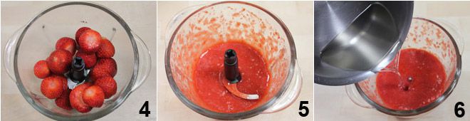 Mientras el jarabe se enfría, limpia y lava bien las fresas bajo el agua corriente y tritúralas 4 hasta obtener una consistencia cremosa 5. Añade el jarabe ya frío al puré de fresas 6