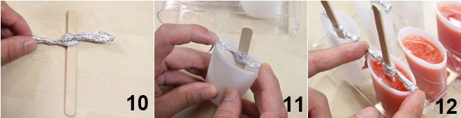 Toma ahora unos palitos de helado comunes y una hoja de papel de aluminio. Forma un pequeño cordón, envuélvelo alrededor del palito 10 y sujeta los extremos a los lados del molde para polos 11. Esto servirá para mantener el palito centrado cuando viertas la mezcla líquida en el molde. En este punto, vierte la mezcla en el molde, dejando 1 cm de espacio del borde 12. ¡Pon tus polos de fresa en el congelador hasta que se hayan solidificado!