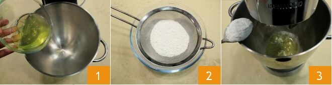 Para preparar las guirnaldas de Merengue a la francesa toma los huevos y separa las yemas de las claras. Vierte las claras en un robot de cocina con batidor 1 y comienza a montarlas a punto de nieve; tamiza el azúcar glas en un bol 2 y agrégalo una cucharada a la vez a las claras 3.