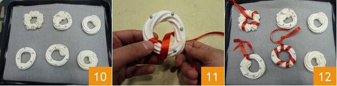 Cuando los merengues estén listos 10, déjalos enfriar, luego decóralos con cintas de raso de colores 11: tus guirnaldas de merengues están listas 12!