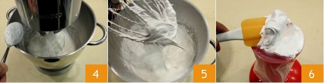 Continúa con el robot de cocina 4 hasta obtener un merengue blanco y espumoso 5. Con la ayuda de una espátula, coloca el merengue que has obtenido en una manga pastelera con boquilla estrellada 6.