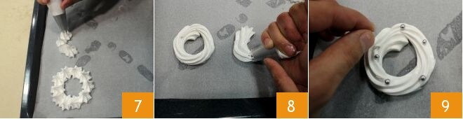 En este punto puedes realizar tus guirnaldas en 2 variantes: sobre una bandeja engrasada y forrada con una hoja de papel de horno, haz montoncitos de merengue uno al lado del otro formando un círculo 7. Continúa con los siguientes haciendo un movimiento circular para obtener otro tipo de decoración 8; finalmente distribuye sobre las guirnaldas que has obtenido las perlas de azúcar de color plata 9. Una vez terminado, seca los merengues en horno ventilado a 100° durante al menos 3 horas, manteniendo la puerta entreabierta.
