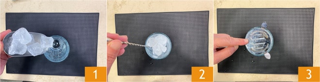 Para preparar el Gin Tonic, basta con verter en el vaso alto el hielo 1 y mezclar con la cuchara de bar 2. Luego, con el colador se puede eliminar el exceso de agua 3.