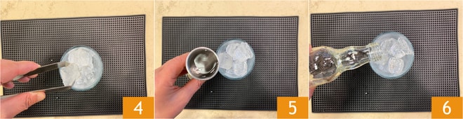 Eventualmente, rellenar con 1 o 2 cubitos de hielo más 4, antes de verter los 4,5 cl de gin 5 y 10 cl de tónica 6, hasta llenar.