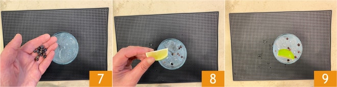 Mezclar con la cuchara de bar, luego añadir en el vaso bayas de enebro 7 y una rodaja de lima 8. ¡Listo para servir un perfecto Gin Tonic 9!