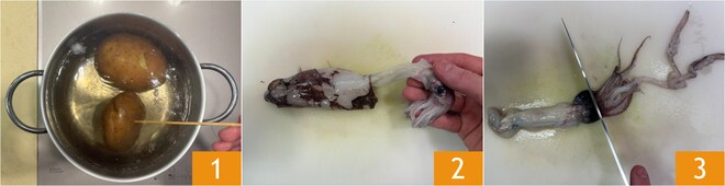 Para preparar los ñoquis al nero di seppia con ragú de sepias, lo primero que hay que hacer es cocer las patatas en agua hirviendo con sal, tardarán unos 30-40 minutos 1. Realizad la prueba del palillo para comprobar cuándo están cocidas, después escurridlas y dejadlas enfriar completamente. Mientras tanto, limpiad las sepias. Extraed la cabeza y las vísceras 2, luego eliminad el pico, situado en el centro de los tentáculos. Separad el cuerpo de los tentáculos y reservad estos últimos 3.